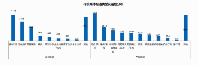 產品新聞20,889篇,占比達54.2%,產品層面新聞內容較為集中,藥品定價/降價,醫保/醫改以及仿制藥等相關報道較多。