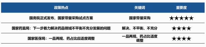 1月政策熱點集中在:國家帶量采購、著力解決藥品領域不平衡不充分發展的問題和一品兩規、藥占比應適度調整等方面。