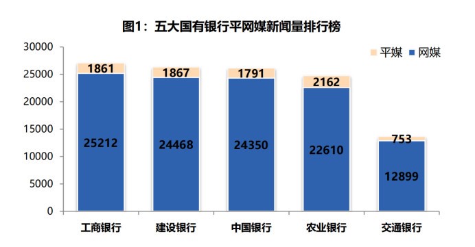 五大國有銀行中, 工商銀行的新聞總量最多,包括了1861篇平媒新聞與25212篇網(wǎng)媒新聞,建設銀行排名第二,交通銀行的新聞總量最少。