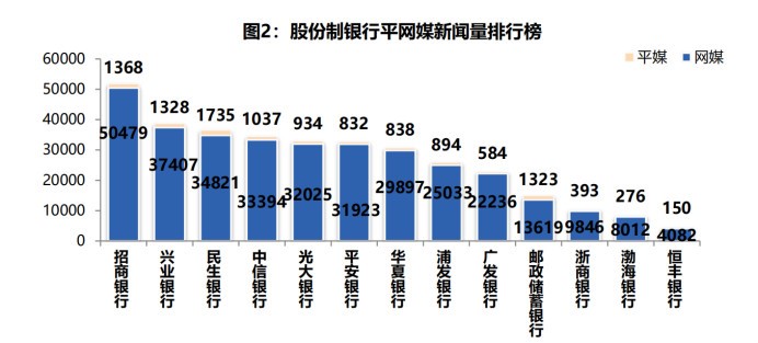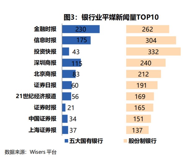 從銀行類型來看,排名TOP10的平媒報道股份制銀行的新聞量多于五大國有銀行。