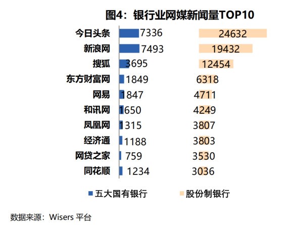 從銀行類型來看,前十家網(wǎng)媒關于股份制銀行的新聞量多于五大國有銀行。