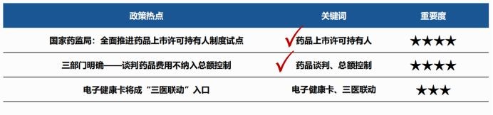 本月政策熱點集中在:國家藥監局:全面推進藥品上市許可持有人制度試點、三部門明確——談判藥品費用不納入總額控制和電子健康卡將成“三醫互動”入口等方面。