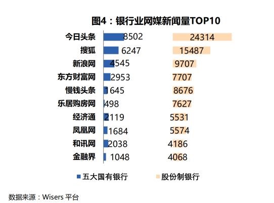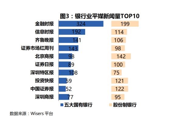 從銀行類型來看,排名TOP10的平媒報道五大國有銀行的新聞總量多于股份制銀行。