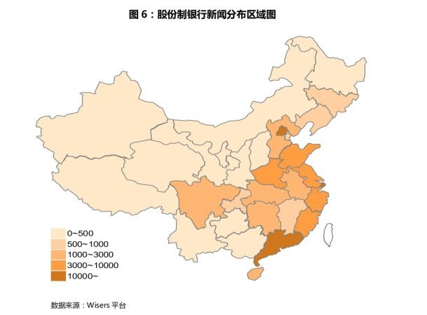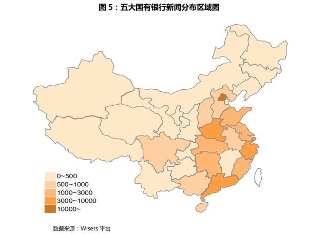 以下為五大國有銀行和股份制銀行的新聞報道的地域分布對比數據: