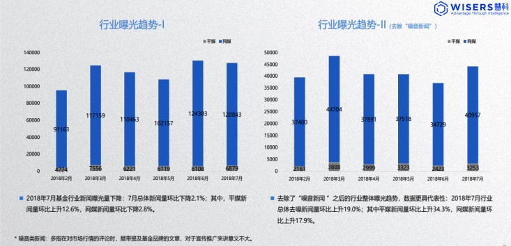 目前,從行業曝光趨勢看,2018年7月基金行業新聞曝光量環比下降2.1%,去除了“噪音新聞”之后的行業整體新聞量環比上升19.0%,另外,行業整體推廣類新聞量環比上升21.7%,敏感新聞量環比上升54.1%。