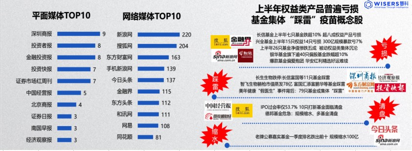 在媒體方面,主要報道了上半年權益類產品普遍虧損,長生生物“假疫苗”案件導致基金公司集體踩雷的消息,此外,受國內股市持續低迷等因素影響,不少基金業績出現虧損甚至遭到清盤,而一些老牌基金今年以來業績不佳導致規模大幅度縮水等話題也受到媒體廣泛關注。