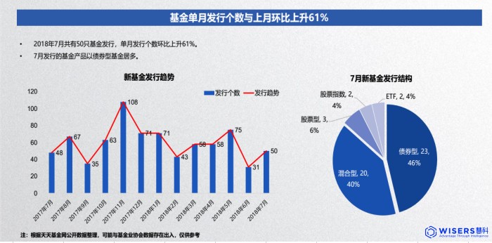 從7月新發基金數量來看,債券型基金發行量最多,共23只,占新發基金的46%,這是由于上半年權益類產品業績普遍下滑讓債基成為大贏家。而對于債市下半場的發展,機構普遍表示樂觀,認為債市將繼續在震蕩分化中保持慢牛格局,配置良機凸顯,使得債基成近期市場寵兒。