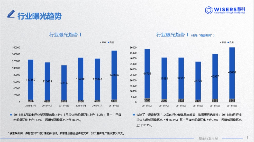 8月份基金行業總體新聞量環比上升18.2%,去除了“噪音新聞”之后的行業整體新聞量,環比上升了16.3%,行業整體推廣類新聞量環比上升了11.0%,敏感新聞量環比下降了3.2%。