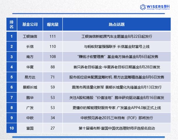 營銷動態方面,8月份首支養老目標基金——華夏養老目標基金正式發行、“賺錢才收管理費”南方瑞合基金正式發售、工銀瑞信新能源汽車主題基金開始發行、鵬華研究驅動混合基金正式發行等新聞受到媒體關注。