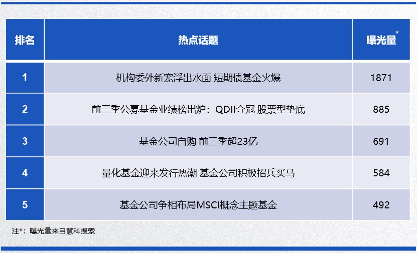 正面話題集中在“短期債基金銷售火爆”、“前三季QDII基金業績奪冠”、“前三季基金公司自購超23億”、“量化基金迎來發行熱潮”等方面。