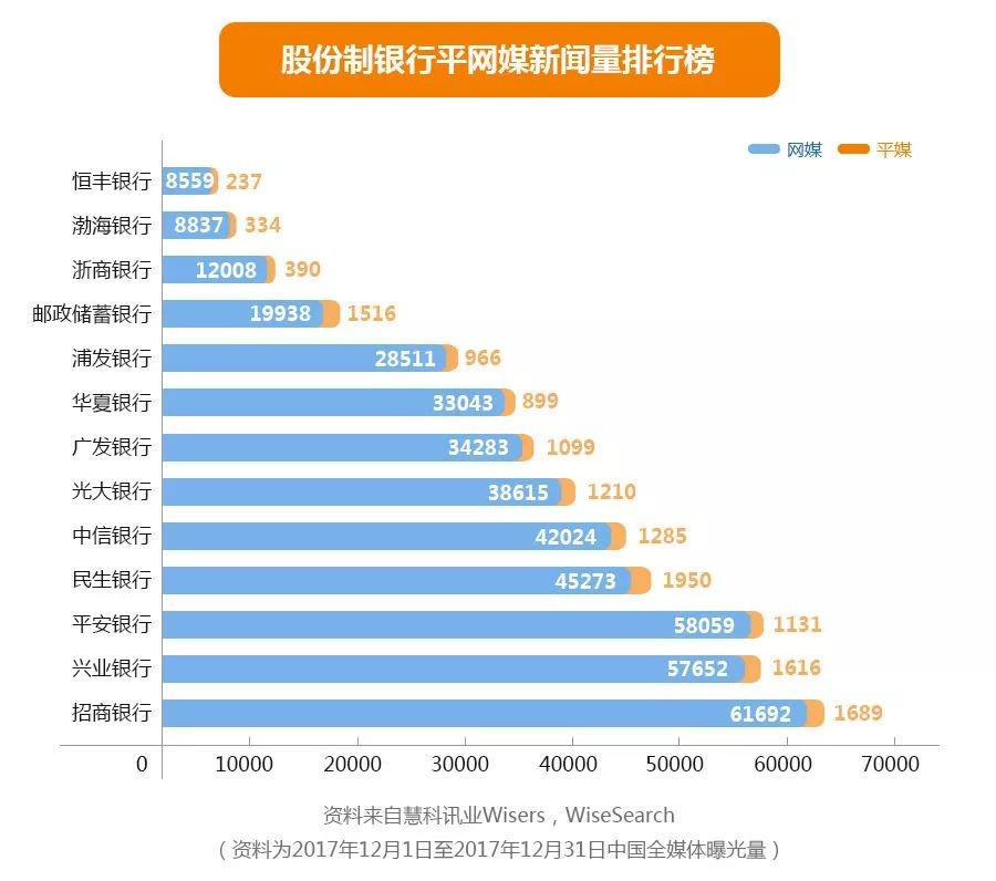 招商銀行的新聞總量最多,包括了2327篇平媒新聞與41930篇網媒新聞,建設銀行排名第二,交通銀行的新聞總量最少。