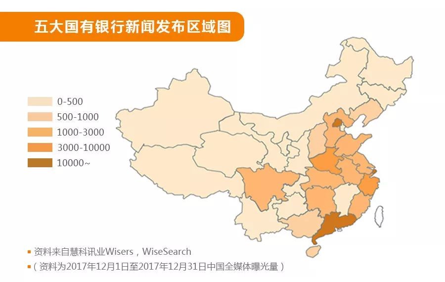 以下為五大國有銀行和股份制銀行的新聞報道的地域分布的對比數據: