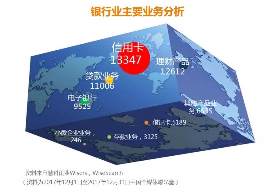 本月銀行業各項主要業務的新聞當中,排名前列的依次為:信用卡、理財產品、貸款業務和電子銀行。