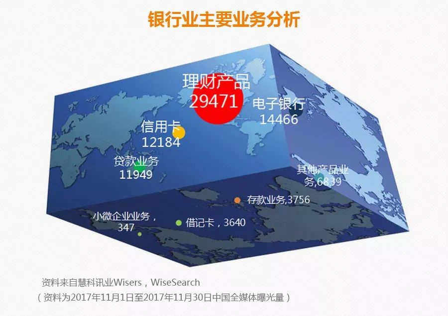 2017年11月,“雙十一”使得銀行信用卡紛紛采取臨時提額等舉措,迎接消費熱潮。臨近年關,關于“理財產品”的新聞量快速上升,其中“廣州老太建行百萬理財夢魘”的事件受到媒體關注,帶來一定的負面影響。