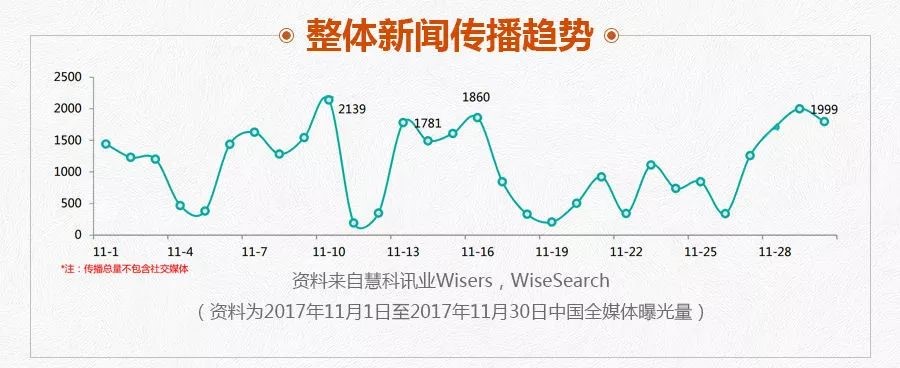 【摘要】本周慧科訊業全媒體行業大數據時間,慧科為大家呈上2017年11月《醫藥行業傳播分析報告》內容,為您呈現2017年11月國內醫藥行業的新聞傳播態勢、傳播熱點和市場分析。本月新聞傳播趨勢起伏明顯,本月中旬,醫藥行業新聞傳播聲量較高。本月傳播較廣的新聞有“默沙東四價宮頸癌疫苗入華投標”“華海藥業兩高血壓藥品通過美國FDA審批” 和“爭奪HPV疫苗市場 GSK聯手阿里后智飛生物組隊美年健康”等。此外,企業財報、企業戰略相關內容也受到媒體關注。