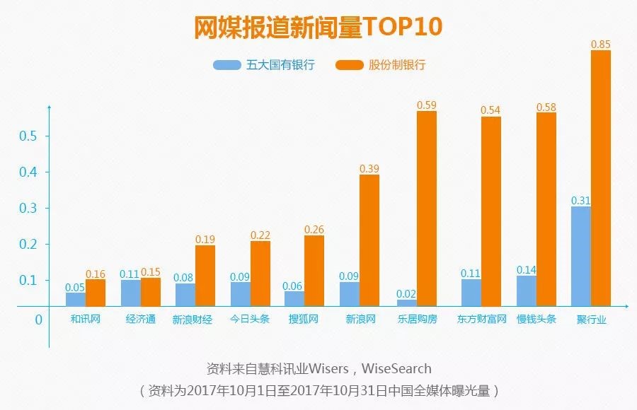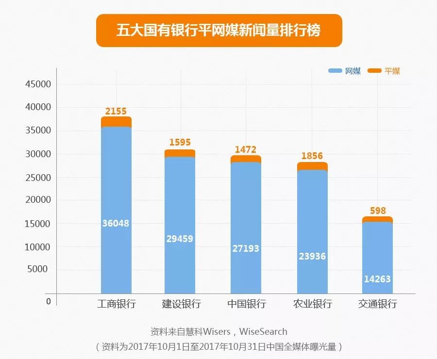 2017年10月,慧科訊業全媒體大數據平臺監測到五大國有銀行新聞有145638條,占銀行業新聞監測總量的26.31%。五大國有銀行中,工商銀行的新聞總量最多,包括了2599篇平媒新聞與35454篇網媒新聞,建設銀行排名第二,交通銀行的新聞總量最少。