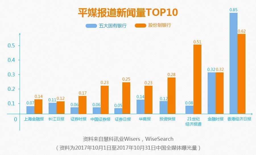 本月平媒報道中,《香港經濟日報》的新聞量最多,共有1084篇,《金融時報》和《21世紀經濟報道》分列二、三位。從銀行類型來看,排名TOP10的平媒報道股份制銀行的新聞量多于五大國有銀行。從報道內容來看,媒體的關注點主要集中在三季度業績和理財能力排名等方面。