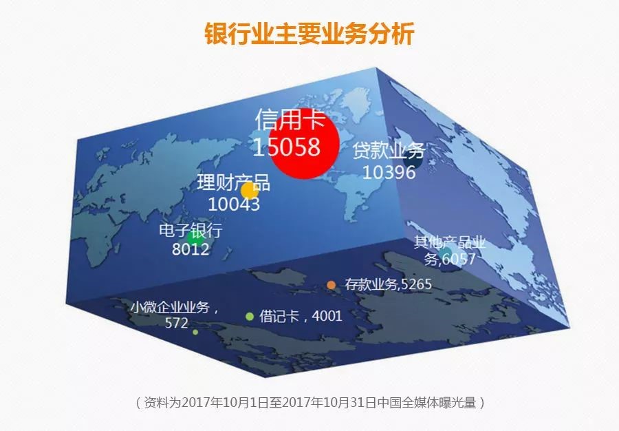 本月銀行業各項主要業務的新聞當中,排名前列的包括:信用卡、貸款業務、理財產品和電子銀行。貸款業務方面的新聞量顯著增多。