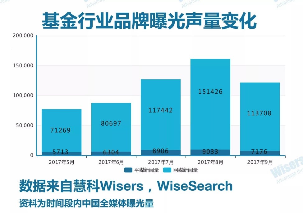 2017年9月,慧科訊業全媒體大數據平臺監測到基金行業新聞曝光總量為120,884篇,較上月有所下降,近半年對比態勢保持良好,近五個月的數據對比如下: