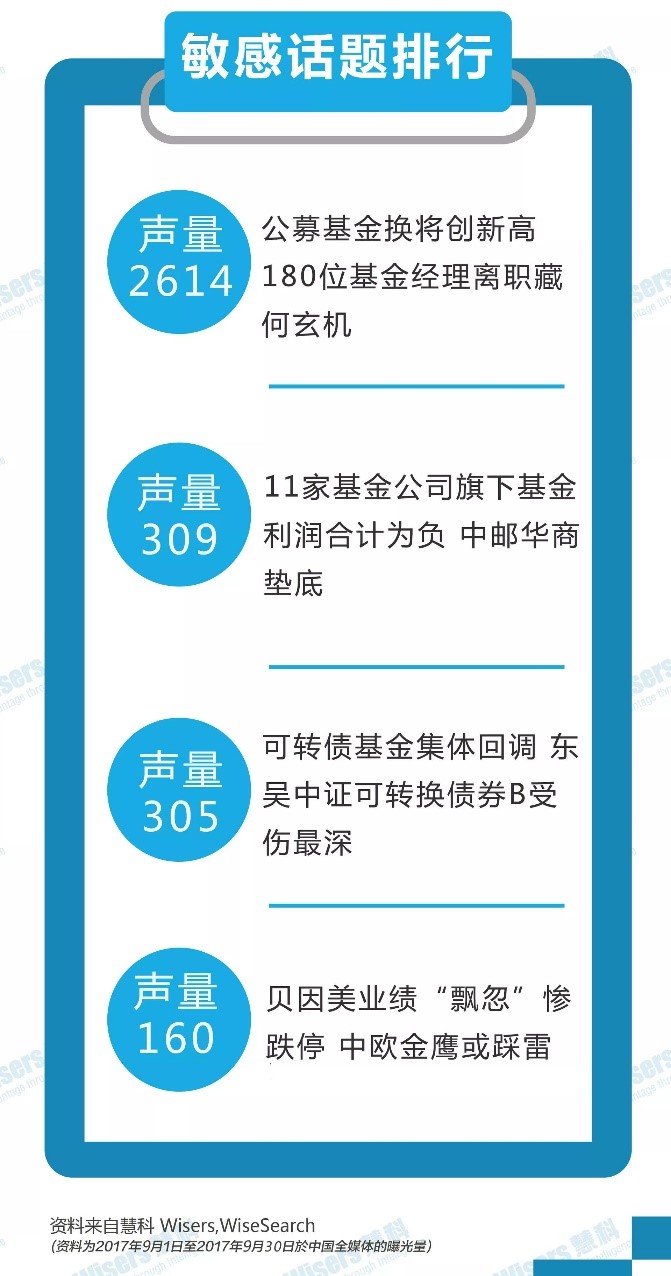 2017年9月,基金行業敏感新聞曝光量與去年同期對比上升5.5%,較上月相比新聞量環比下降57.3%。
