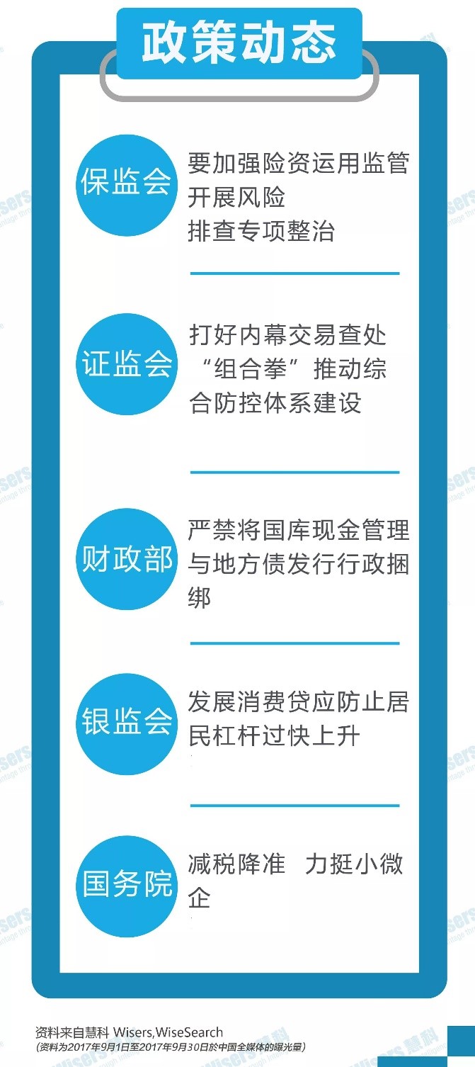 2017年9月,監管出臺的政策相對較少。監管層方面,仍以“去杠桿”“風險防控”“嚴控內幕交易”“穿透式監管”“力挺中小微實體經濟”作為核心思想。監管重點主要集中在流動性風險、協作監管、券商風險等方面。本月主要政策動態如下: