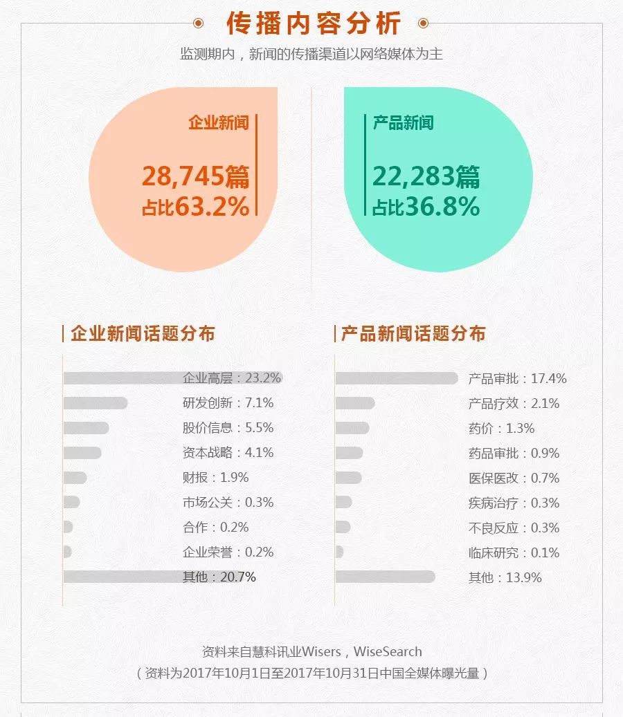 △監測期內,新聞的傳播渠道以網絡媒體為主。傳播內容來看企業新聞18,831篇,占比63.2%,重點內容有企業高層、研發創新和股價信息等。產品新聞10,971篇,占比達36.8%,媒體主要關注點在產品審批、產品療效和藥價方面。