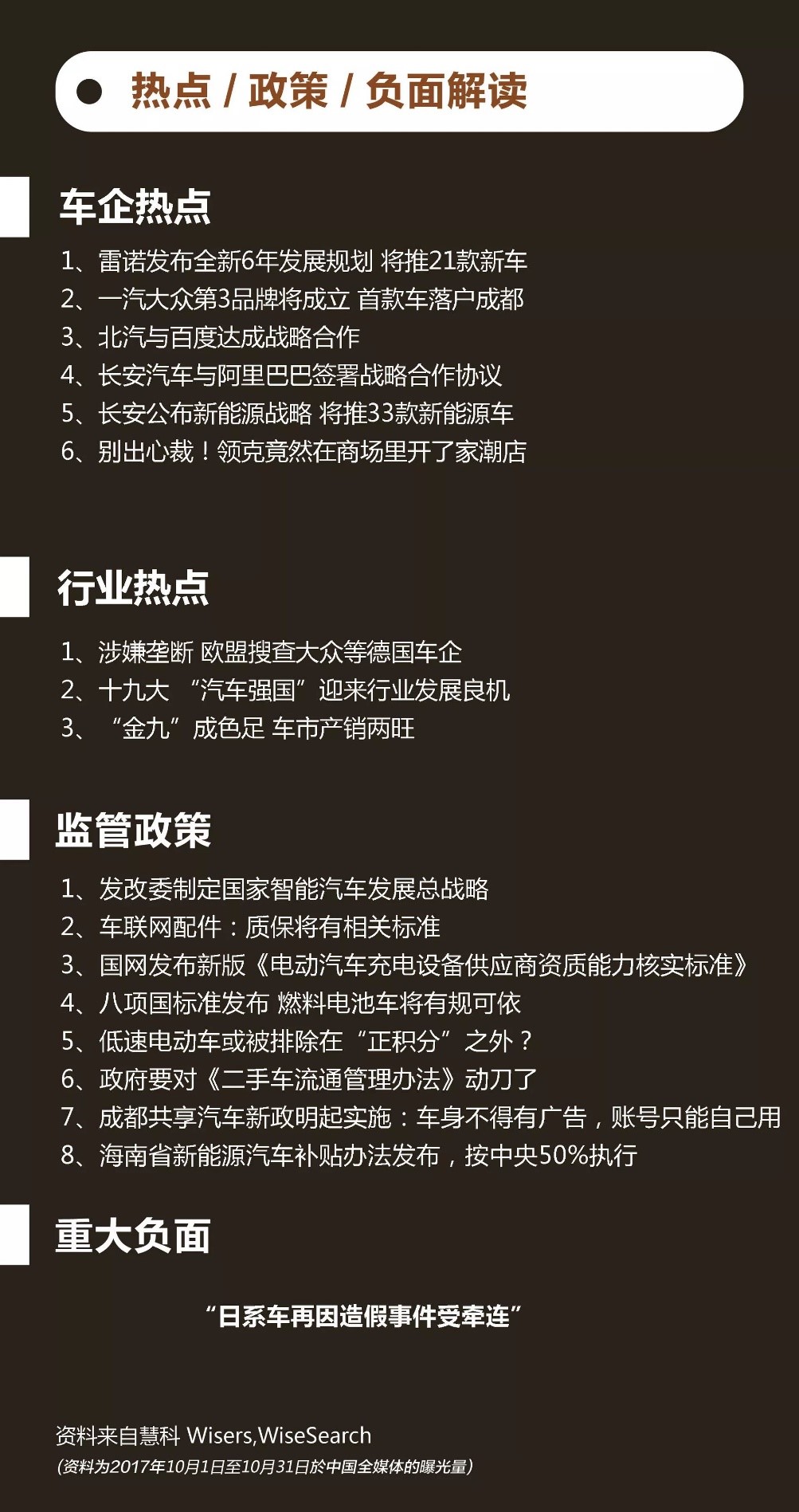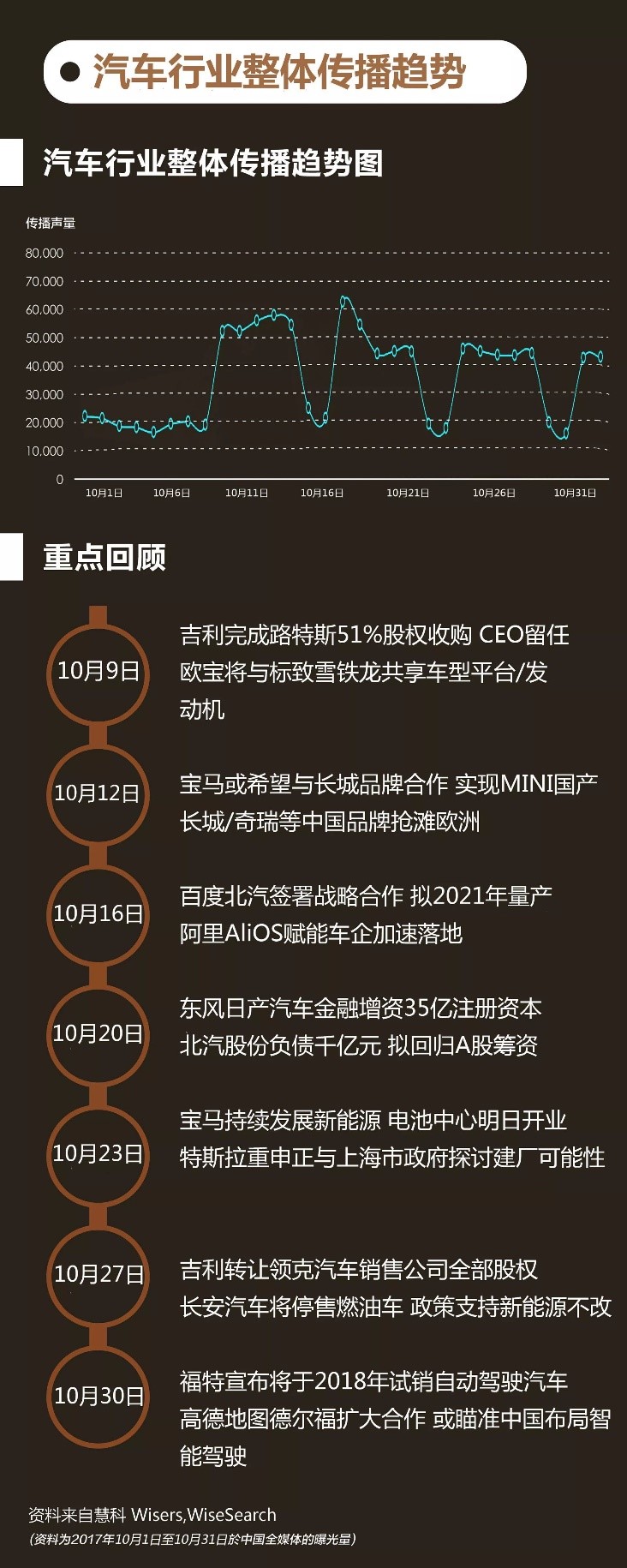 通過慧科訊業全媒體大數據平臺監測的本月熱點新聞來看,金九銀十、電動汽車等話題占據本月汽車行業話題主流,車市銷量一路走高,加上十九大的“汽車強國”的內容,為汽車行業打上一劑定心丸。