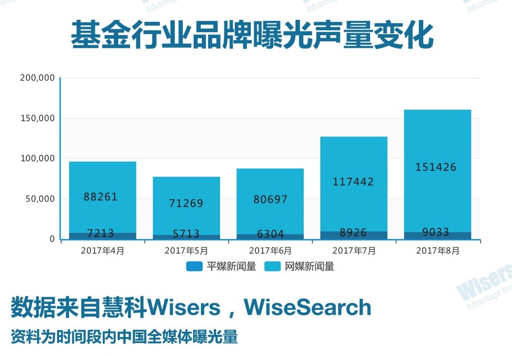 2017年8月,慧科訊業全媒體大數據平臺監測到基金行業新聞曝光總量為160,459篇,傳播態勢繼續上揚,近五個月的數據對比如下: