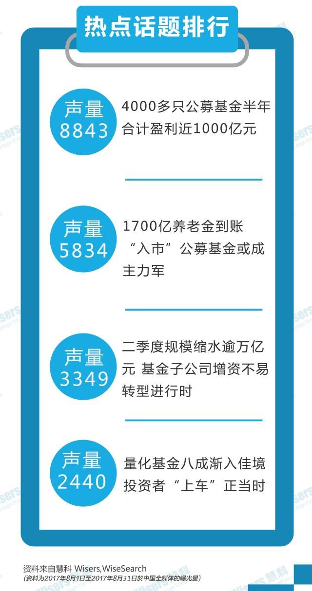 【摘要】本期慧科訊業全媒體行業大數據時間,慧科為您呈上基金行業媒體監測分析精彩內容,讓我們一起來回顧2017年8月基金行業發展態勢,解讀行業整體的傳播現狀,洞悉行業發展趨勢。本月基金行業總新聞量環比上升,傳播態勢繼續上揚。品牌曝光方面,天弘基金繼續排名第一;熱點營銷事件中,興全基金的“股債雙五星公司再發新品 興全恒益基金火熱發行中”曝光量居首。熱點推廣事件中,前海開源基金的“前海開源楊德龍:經濟新周期中的投資機會”曝光量居首。熱點產品中,天弘基金的“余額寶”產品居首。