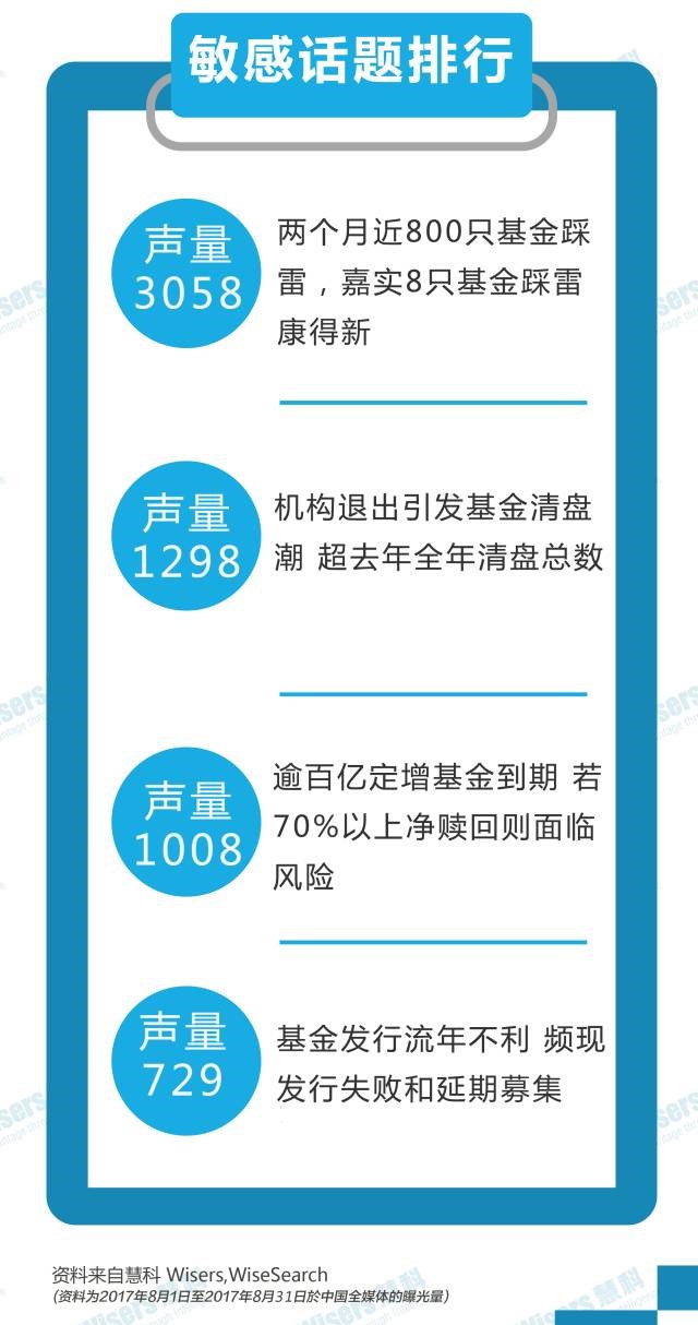 2017年8月,基金行業敏感新聞曝光量與去年同期對比上升104.2%,較上月相比新聞量環比下降0.3%。
