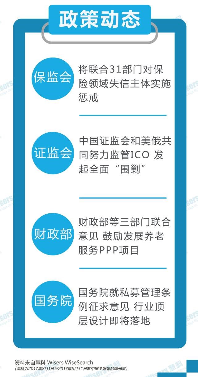 2017年8月,證監會重拳監管ICO、銀監會發布《信托等級管理辦法》、國務院就《私募管理條例》征求意見、保監會將聯合多部門對保險領域失信行為進行懲戒。本月主要政策動態如下: