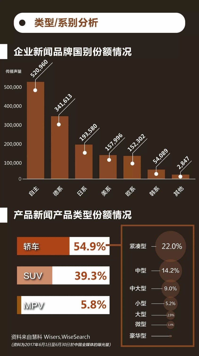 本月監測期內,車系份額中自主車企最高,為520960篇,占比為36.6%,占比較上月繼續上升;德系汽車占比24.0%,較上月亦有所上升。