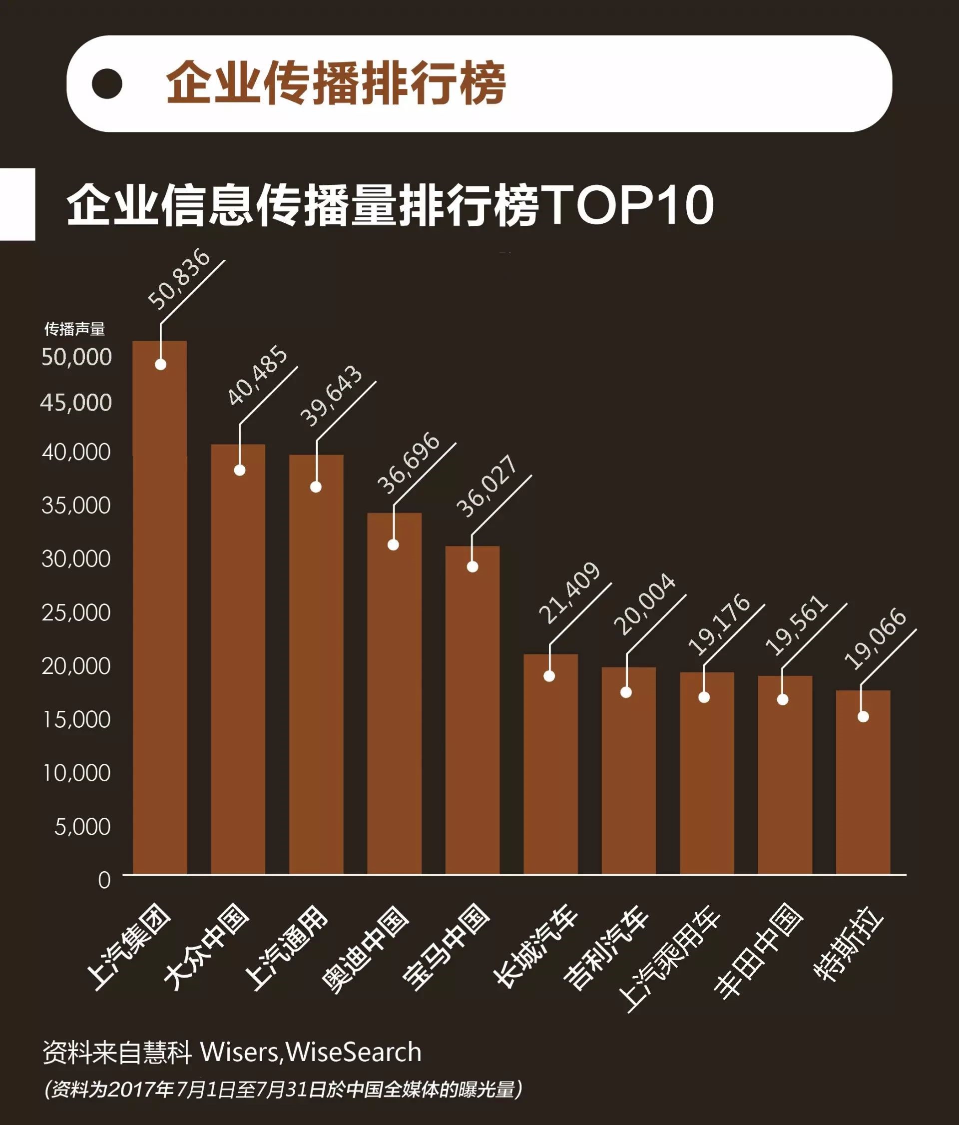 本月企業(yè)信息傳播聲量TOP10車企中,上汽集團(tuán)、大眾中國、上汽通用三家車企分別以50836篇、40485篇、39643篇的新聞傳播量排前三名。