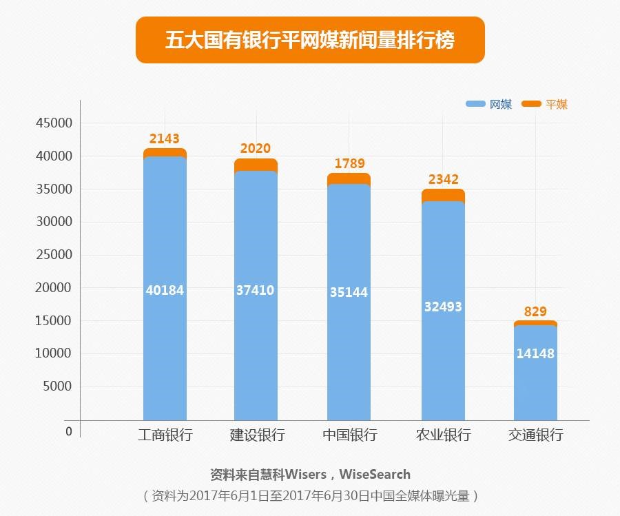 2017年6月慧科大數據平臺監測到五大國有銀行新聞有168502條,占銀行業新聞監測總量的28.74%,其中工商銀行的新聞總量最多,包括了2143篇平媒新聞與40184篇網媒新聞;建設銀行排名第二,交通銀行的新聞總量最少。國有銀行新聞內容主要為各個銀行的業務合作相關報道。