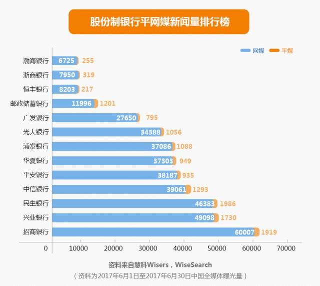 股份制銀行新聞有417780條,占比為71.26%。招商銀行的新聞總量最多,包括1919條平媒新聞和60007條網媒新聞;興業銀行和中信銀行的新聞總量分列二、三位,渤海銀行新聞總量最少。