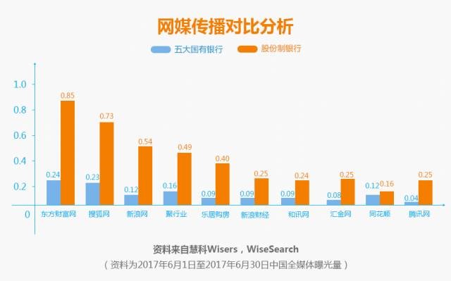 本月銀行業新聞量排名前十的網媒中,東方財富網的報道量最多,相關報道23862篇,搜狐網及新浪網排名第二和第三。從銀行類型來看,前十家網媒關于股份制銀行的新聞量多于五大國有銀行。從報道內容來看,媒體的關注點主要集中在銀行薪酬和理財收益率等方面。