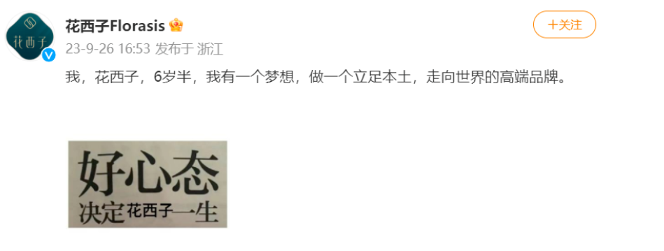 9月26日,花西子官方微博發文“我,花西子,6歲半,有一個夢想,做一個立足本土,走向世界的高端品牌。”并配圖文字:好心態,決定花西子的一生,同時在評論區回復相關爭議。秒上熱搜后,花西子評論區翻車,有網友直接表示是“發瘋文學”,還有人直指花西子偷換概念,刷新了公關認知。