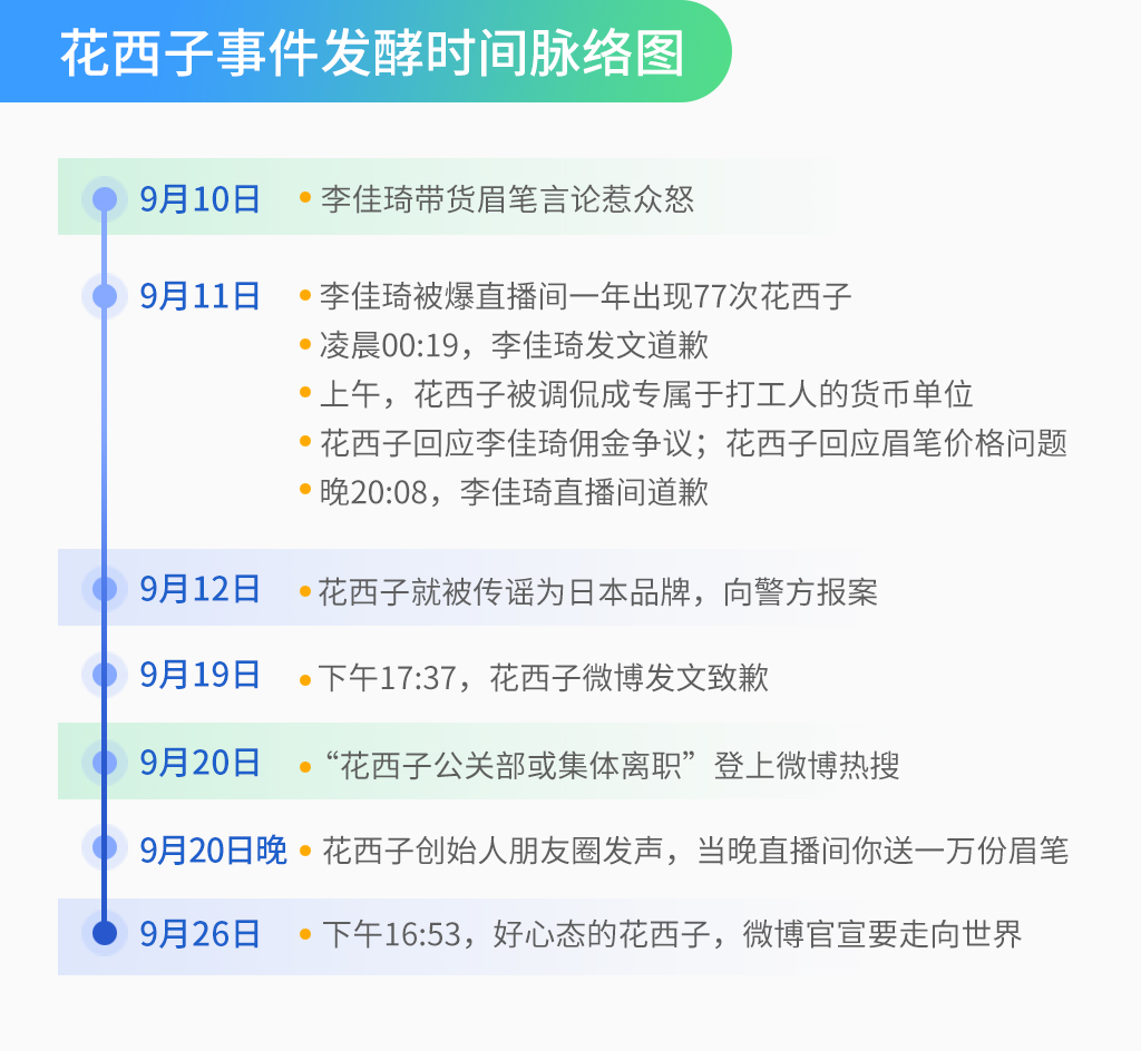 回顧本次事件,從9月10日李佳琦直播間因花西子眉筆價格懟網友而惹眾怒,帶著花西子一起沖上熱搜。大眾苦等一周后,花西子官方微博才于9月19日晚間發布了姍姍來遲的《一封信》,對于近一周多以來因李佳琦不當言論引發的“討伐國貨”事件感到“惶恐、無措”,并致歉。此舉再次將花西子推到了風口浪尖,有消息爆出,該內容并非出自公司公關部之手,其公關團隊已出現人事變動,多位員工離職。
