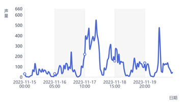 據慧科訊業智能數據平臺WisersOne監測顯示,在2023/11/15-2023/11/21期間,共監測到廣州車展相關信息28431條,在整個傳播過程中,信息主要發布于網媒、APP、微博等平臺,并于2023/11/17 21:00達到傳播高峰。