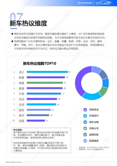 廣州車(chē)展預(yù)熱期間,慧科訊業(yè)新車(chē)熱度指數(shù)前十關(guān)鍵詞包括:設(shè)計(jì)、配置、銷(xiāo)量、能源、價(jià)格、運(yùn)動(dòng)、空間、服務(wù)、豪華、四驅(qū)。其中,有關(guān)車(chē)輛性能安全及外觀設(shè)計(jì)的詞匯討論熱度最高,表明消費(fèi)者在討論新車(chē)時(shí)對(duì)性能安全尤為關(guān)注,同時(shí)也注重外觀設(shè)計(jì)等因素。