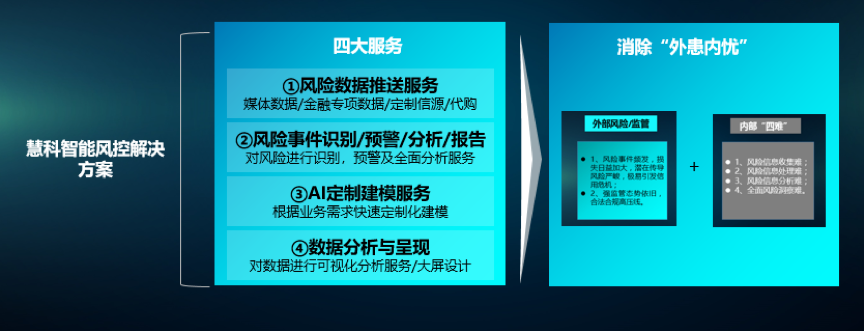在與某國有銀行打造安全防控體系合作中,慧科訊業智能風控平臺通過風控平臺搭建、風控解決方案和專家咨詢服務幫助其構建大數據風控引擎,同時通過風控平臺幫助銀行解決對公信貸、投研、監管等場景風險識別問題。通過引入慧科訊業提供的智能風控平臺,嵌入慧科訊業領先的大數據處理能力和先進的NLP算法模型,能針對每個客戶進行輿情風險評估;同時,慧科訊業還提供AI專家咨詢服務,幫銀行內部快速構建自己的風控業務模型。