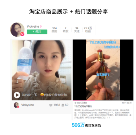 玩法一:美拍成了很多淘寶店主的引流入口。商家通過分享商品試用來增加曝光,雖然帖文中出現明顯的淘寶商品鏈接,但從百萬級的播放量來看,美拍用戶似乎也并不在意這樣的“硬推銷”,這也契合了現在社交消費 (Social Commerce) 的趨勢: