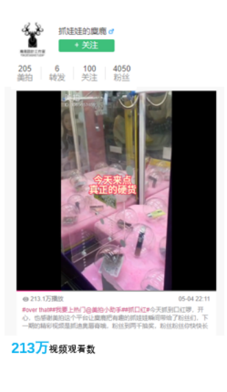 玩法二:美拍上刮起了一股“抓娃娃”風潮,各類五花八門的“專業抓娃娃”博主現在也開始抓起了大牌美妝,這種混搭的“獵奇感”成功吸引了美拍用戶的興趣。